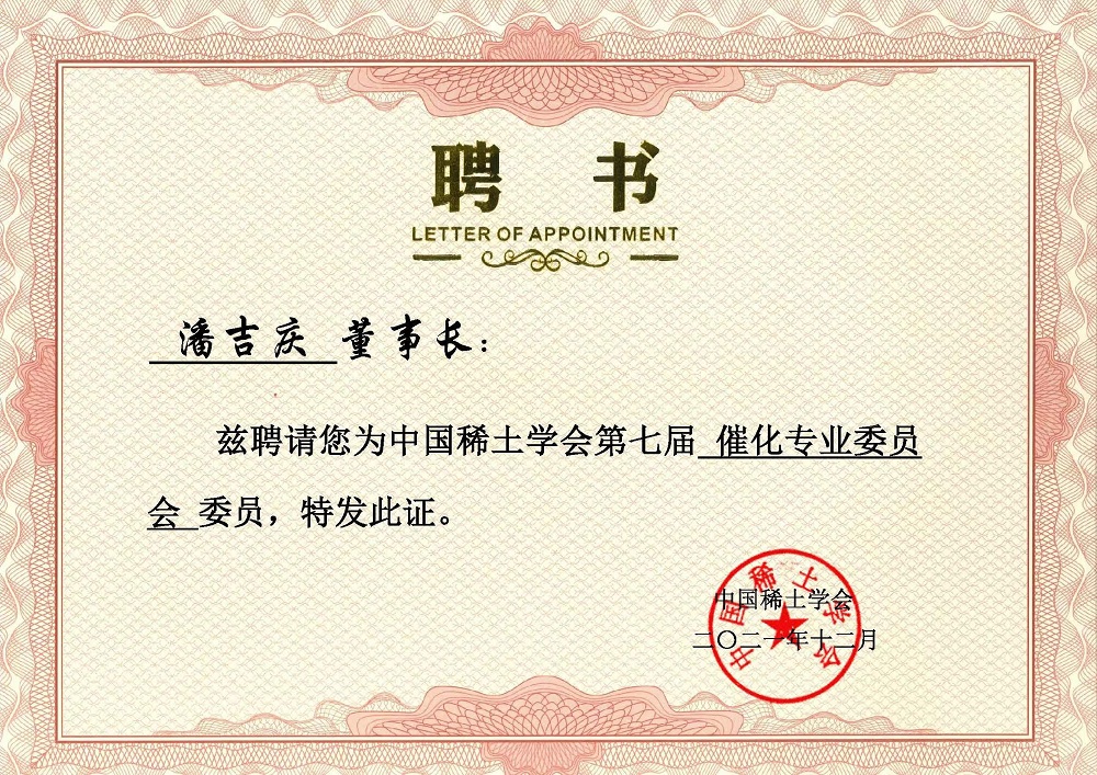 【概要描述】近日,公司董事長(zhǎng)潘吉慶先生被中國(guó)稀土學(xué)會(huì)聘為“第七屆催化專業(yè)委員會(huì)委員”。